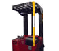 The Backbone™ is a safety device for reach trucks and standup counterbalanced trucks to protect operators against accidental rear-ward collisions with racking systems that may cause serious injury without reducing overhead guard protective capability. The Backbone™ is installed on a reach truck by simply clamping to the overhead guard from the top and bolting to the reach truck frame at the bottom by drilling small holes. No welding required. Additional padding is strapped onto the back of the unit for operator comfort.
